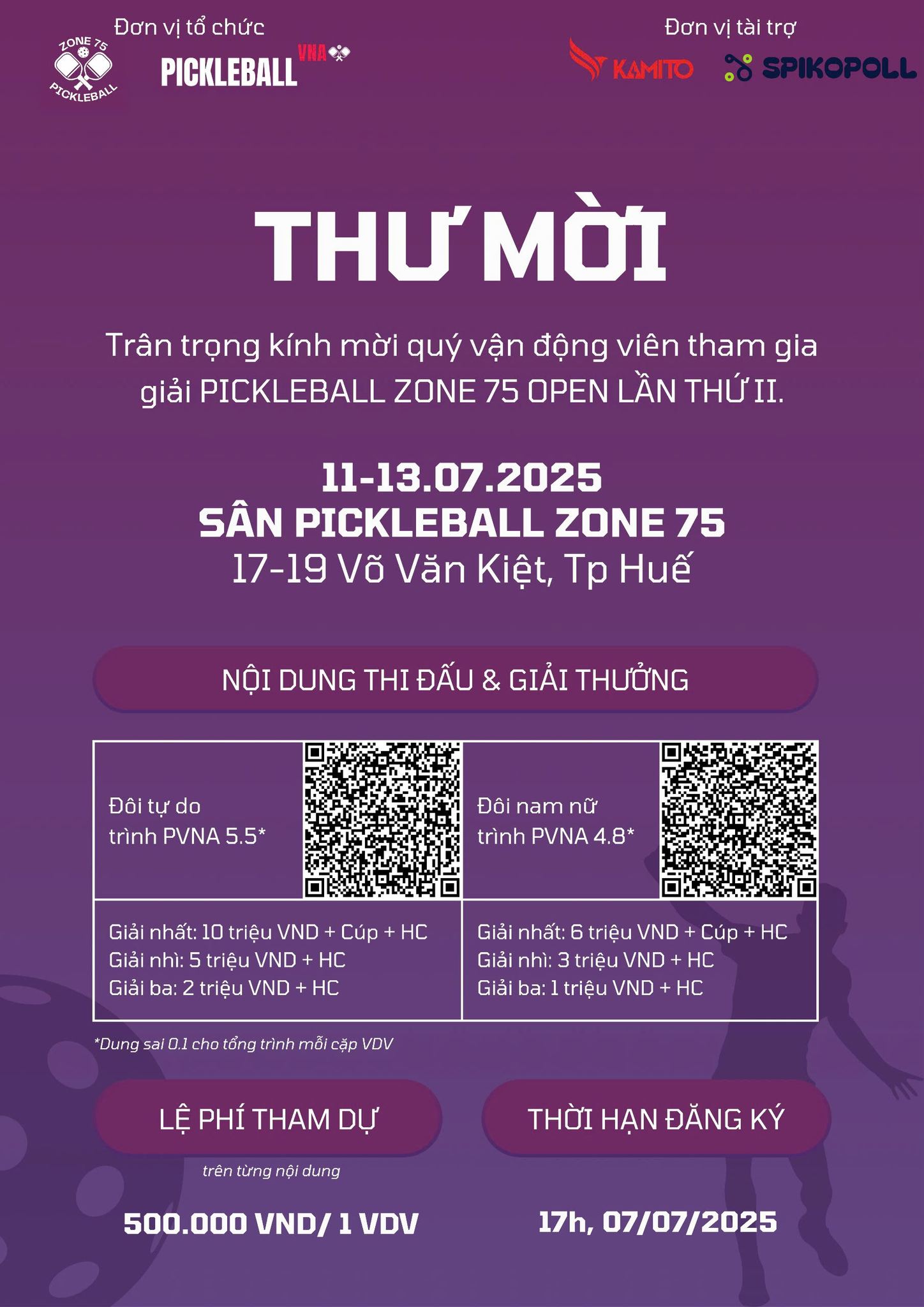 - Địa điểm: Sân Pickleball Zone 75, 17-19 Võ Văn Kiệt, Thành phố Huế