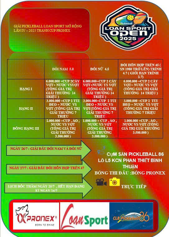 Giải Pickleball Loan Sport Mở Rộng Lần IV – 2025 Tranh Cup Pronex: Sân Chơi Đẳng Cấp Dành Cho Cộng Đồng Pickleball Việt Nam!